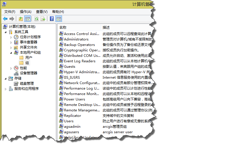 成功解决问题! 2.arcgis server10.0,使用arcgissom账户无法登录arcgis server manager,提示:必须以agsadmin的组成员的账户进行登录;原因:agsadmin组成的账户成员具有登录arcgis server manager的权限;解决方法:打开本地用户和组;选择计算机,右键属性,选择管理,打开计算机管理窗口,选择本地用户和组,双击打开组,如截图:
