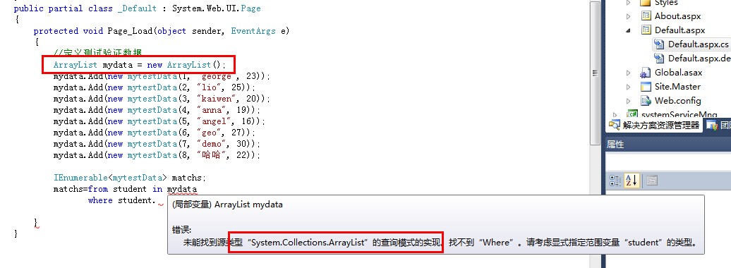 }在页面page_load中初始化测试数据,原本想了想既然是查询对象数据集合,那就定义一个ArrayList装载自己的定义的数据类,在编写LinQ表达式的时候发现了一个问题:
