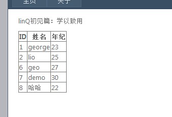 //3 过滤和排序 IEnumerablematchs; matchs = from student in mydata //student是查询mydata集合中的对象的假名 where student.age > 20 //查询过滤条件 orderby student.age //排序 select student; //页面绑定数据展示 GridView1.DataSource = matchs; GridView1.DataBind();