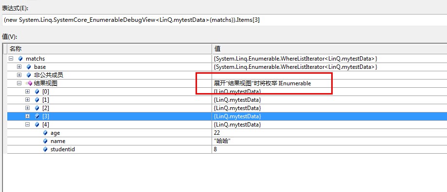 mydata.Add(new mytestData(8, "哈哈", 22)); //1.最简单的实现linq表达式