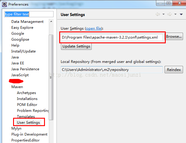 window-》prefrences-》maven-》user setting。如图