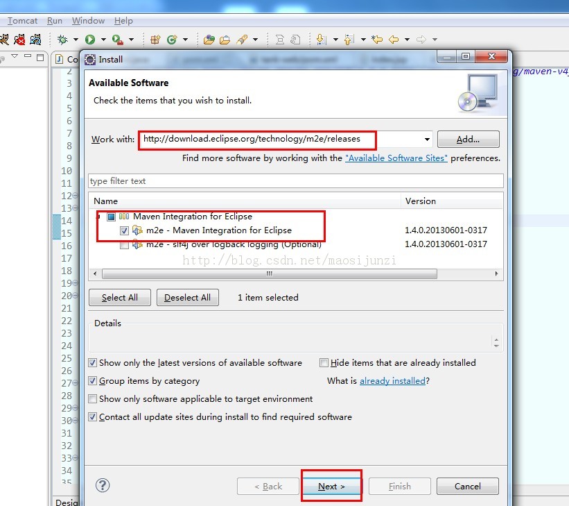 第二种方法:打开eclipse->help->install new software。在work with后输入:http://download.eclipse.org/technology/m2e/releases。如图: