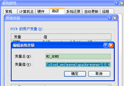 3.配置maven3的环境变量:先配置M2_HOME的环境变量,新建一个系统变量:M2_HOME , 路径是:D:\cloud_cms\maven\apache-maven-3.0.4,如图所示: