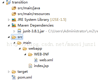 这个简单,new-》other-》maven project-》next。这里注意groupid选org.apache.maven.archetypes ,artifactid 选maven-archetype-webapp,然后next,输入我们自己的groupid(com.test),artifactid(transition),然后finish,OK。如图所示: