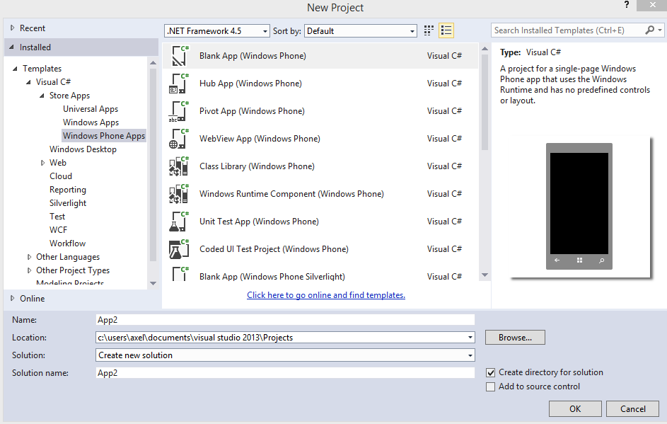 Universal Apps是一个统一的项目,可以将Windows Store和Windows Phone 8.1创建在一个项目中,直接用一套Core,两个UI。这绝对是一个非常有用的功能。上面的项目模板中你感觉到陌生的可能是Hub App,其实就是之前的Panorama项目,名字被改成了Hub。这次我们就来创建一个Windows Phone8.1的项目。而且只能创建WP8.1的项目,不像VS2012一样可以选择创建7.1还是8.0的项目。我想微软可能是出于目前所有8.0的手机都可以免费升级到8.1的考虑,不过我想今后的一段时间8.0的项目还将是主流。