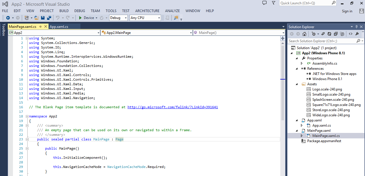 上面这张图就是创建好的项目了。首先你感觉到的也是最大的变化就是所有的命名空间怎么都是Windows Store里的,这就是前面提到的存在Universal App的原因。在WP8.1的SDK中所有的命名空间简直大换血,完全和Windows Store统一,不再是单独的一套API命名。不光是命名空间,这次变更做的非常之彻底,彻底到连Windows Store中的控件都直接可以再WP中使用,比如,FlipView, GridView, ListView, RichEditBox, PasswordBox, SemanticZoom。