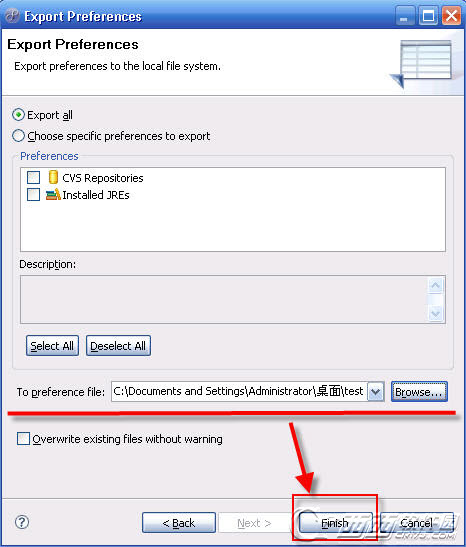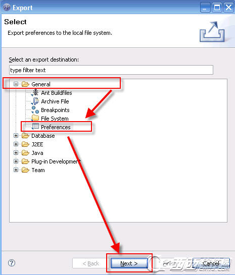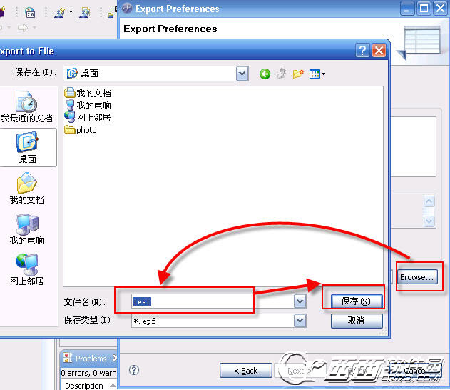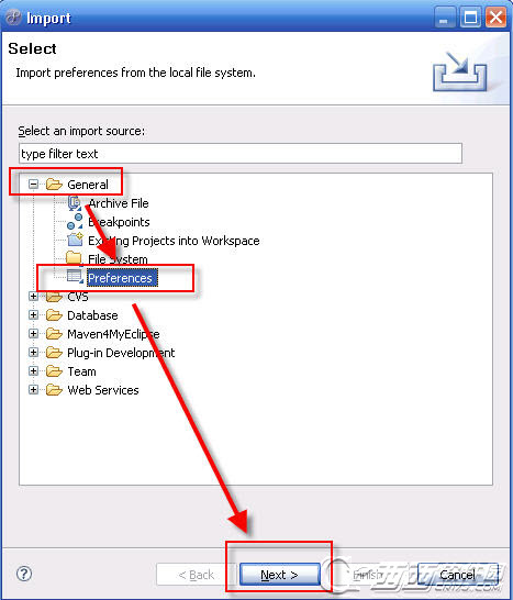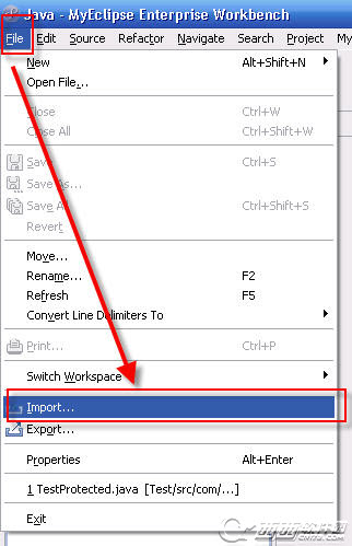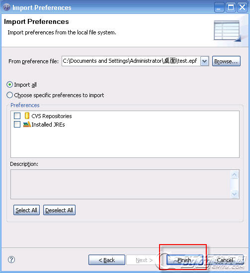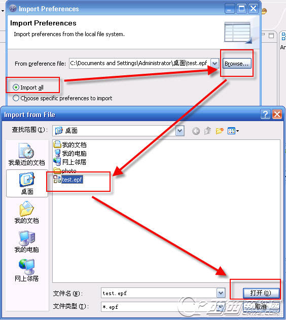 12. 回到MyEclipse 6.5 界面,“File”→“Import”,在弹出的窗口中选择“Perferences”,点击“下一步”,选择刚在已经修改的“test.epf”文件,点击“打开”,点击“Finish”。该步骤和上面的导出步骤类似。