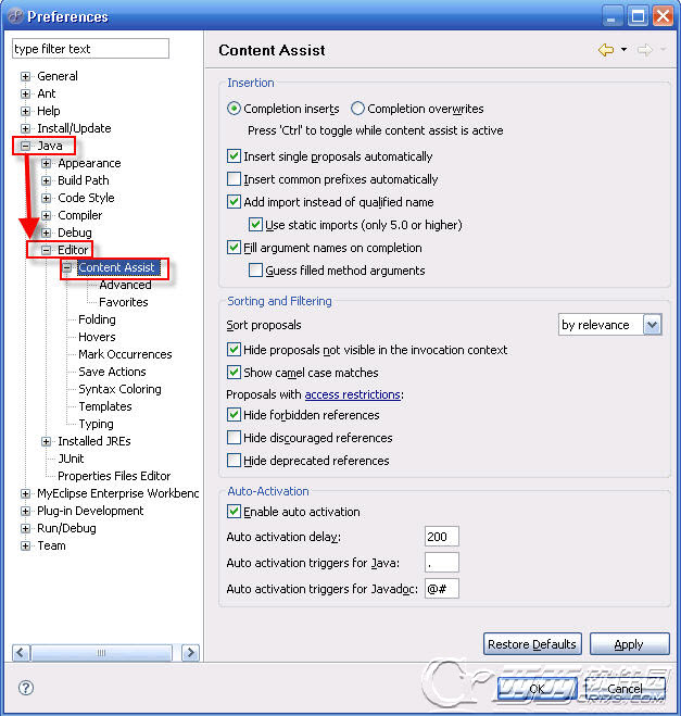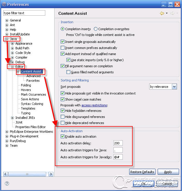 增强Eclipse ,MyEclipse 6.5 的代码提示功能,具体怎么样来配置?下面开始说步骤(注意本人用的MyEclipse 6.5做讲解,其他的,原理都是一样的):