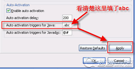 4.“Auto Activation triggers for java”这个选项,在“.”后加abc字母,方便后面的查找修改。然后“apply”,点击“OK”。