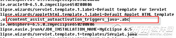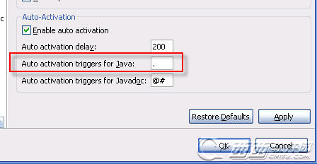 “Auto Activation triggers for java”这个选项就是指触发代码提示的的选项,把“.”改成“.abcdefghijklmnopqrstuvwxyz(,”的意思,就是指遇到26个字母和.,(这些符号就触发代码提示功能了。
