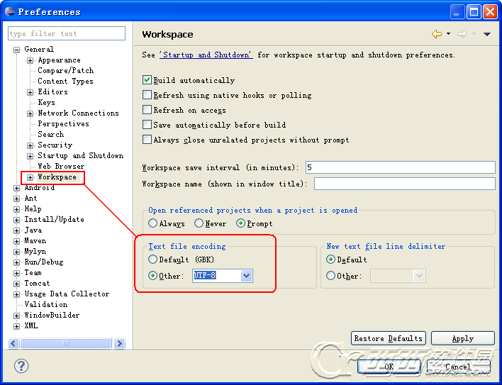 Eclipse默认的新项目的编码是GBK,修改eclipse的配置,可以使得eclipse的新建项目的默认编码直接为UTF-8 在菜单栏的Window->Preferences->General->Workspace->Text file encoding 将其改为UFT-8即可。这个也是安装完Eclipse之后应该立刻做的一件事但是这种修改只对当前的workspace有效,如果新建或者切换到一个新的workspace下,还是得做同样的步骤。