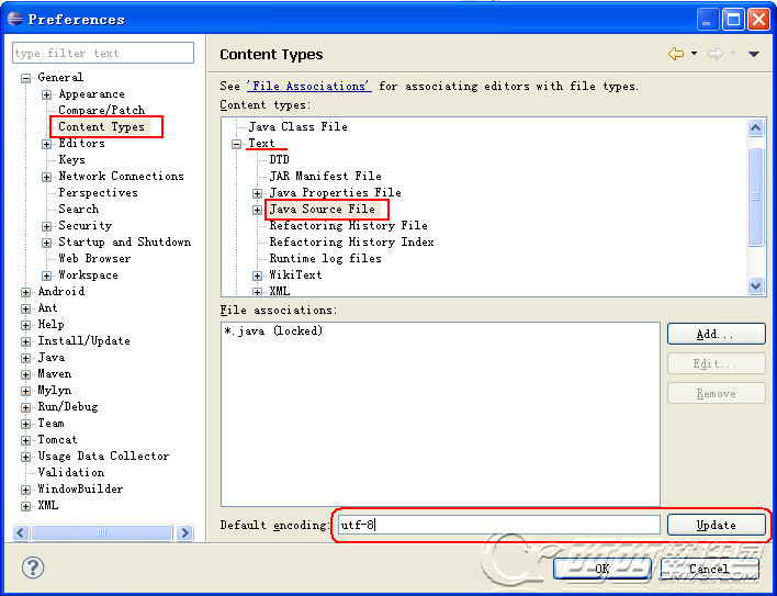 选择Text树,点开,选择Java Source File,在下面的Default encoding输入框中输入UTF-8,按下Update按钮,则设置Java文件编码为UTF-8。