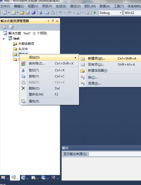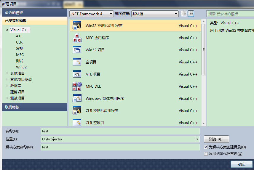 1)、文件->新建->项目->Visual C++->Win32 控制台应用程序(输入名称test)