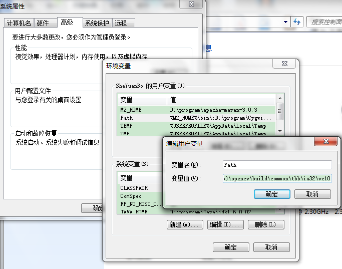计算机->(右键)属性->高级系统设置->高级(标签)->环境变量->(双击)path(用户,系统里面的path任选其一)->在变量值里面添加” %opencv%\build\x86\vc10\bin”和”%opencv%\build\common\tbb\ia32\vc10”(里面的%opencv%记得换成自己的opencv路径。例如我的:D:\program\ifly\bin;D:\Program Files (x86)\opencv\build\x86\vc10\bin;D:\Program Files (x86)\opencv\build\common\tbb\ia32\vc10)。