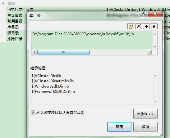 3)、配置“库目录”项:添加行”%opencv%\build\x86\vc10\lib”即可。