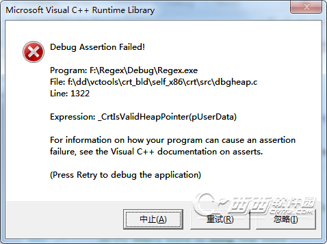 看了下错误信息真的是堆问题,调试下发现是这句if (re!=NULL) free(re);执行不了,再次调试发现前面re这个对象已经通过free(re)释放了,这里按理说re应该为NULL了也就是不会再次 free(re)了啊,可是实际运行的确re不为NULL因此再次free了re,相当于一块本来已经释放了的内存空间再次被释放,肯定会出现堆错误了。 将该条件语句注释掉后,运行成功,然后在Eclipse下注释掉该句也是运行成功。现在问题就来了: