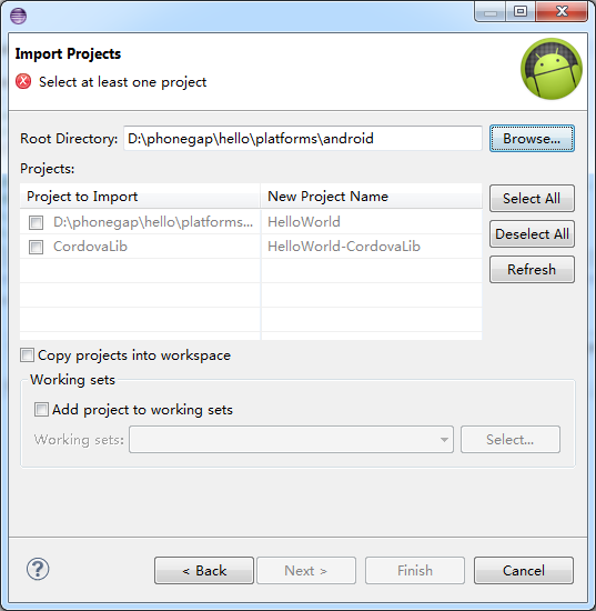 打开Import Project面板,点击Browse...按钮,找到刚才建立的hello\platforms文件夹下的android文件
