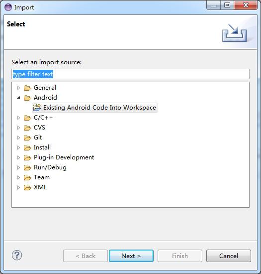 选择android->Existing android code into workspace 再点击next