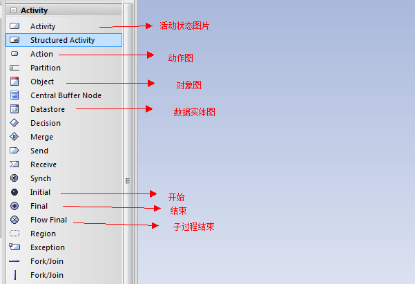(5)、动作状态与状态图中的状态不同,它不能有入口动作和出口动作,更不能有内部转移。