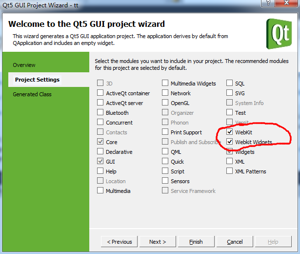 在"Project Settings"里面选中“WebKit”和“Webkit Widgets”选项: