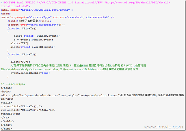 e这个变量表示的是一个事件对象,我们只需要写一点点跨浏览器的代码来返回目标元素,在IE里目标元素放在srcElemtn属性或event.toElement属性中,而在其它浏览器里则是target或event.relatedTarget属性。