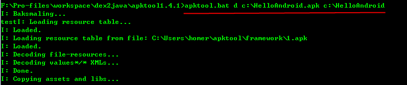 上图中,apktool.bat 命令行解释:apktool.bat d -f [apk文件 ] [输出文件夹]