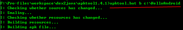 将反编译完的文件重新打包成apk,很简单,输入apktool.bat b abc123(你编译出来文件夹)即可,命令如下: