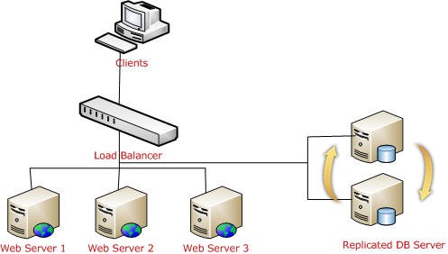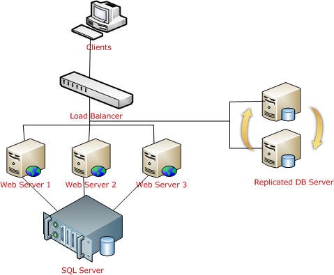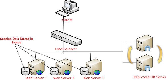 如上图所示,所有的web服务器Session数据都将被存储于一个SQL Server数据库。请记住一点,在StateServer模式和SQL Server模式下你都将把对象进行序列化存储。当一台Web服务器挂掉的时候,负载均衡器将把请求分发到其他服务器他将能从数据库里取出Session数据,因为所有Session数据都是存放于数据库里的。