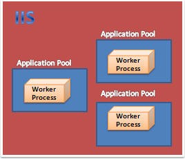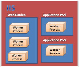 如上图所示,在IIS里,将会有多个应用程序池,并且每个应用程序池至少有一个工作进程,而一个Web Garden将有多个工作进程。