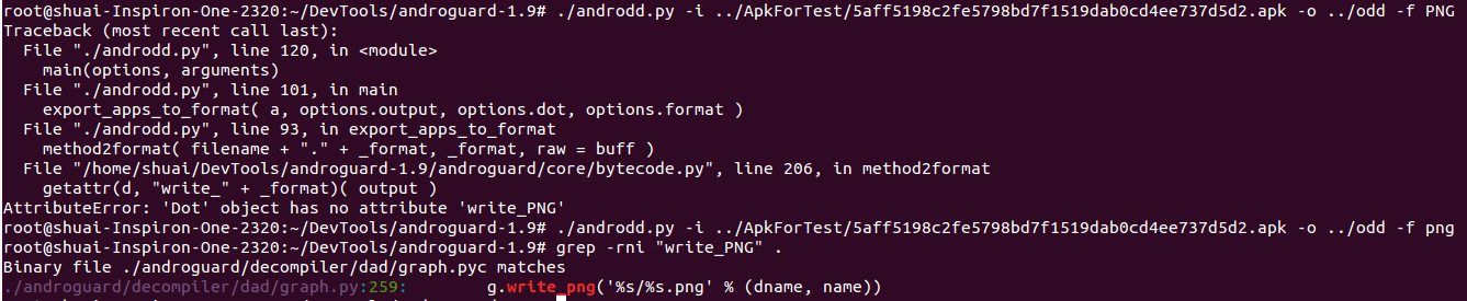 androdd.py用来生成apk文件中每个类的方法的调用流程图。可以选择生成.dot格式的,另外还可以在PNG和JPG中的一种,其中DOT是一种图形描述语言,使用次方法要注意的一点是Wiki上提示的选择图形格式时“-f PNG”使用的大写字母,实际运行时发现会报错。如下图: