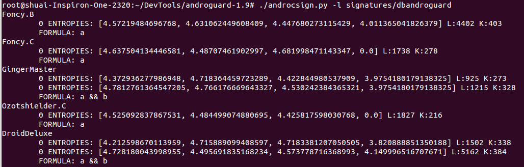 在Androguard目录下新建一个apks目录,将apk复制进去,然后将plankton.test.sign文件复制到Androguard的signatures目录下,在终端提示符下执行下面的命令: