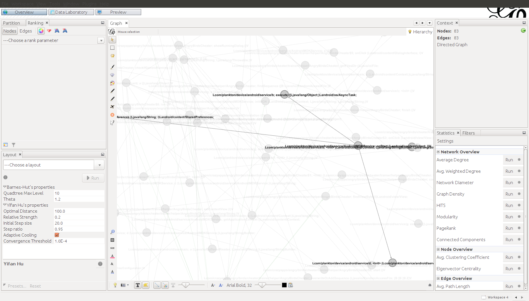androgexf.py用来生成APK的GEXF格式的图形文件。该文件可以使用Gephi查看。Gephi软件可以改变图形的布局,显示和隐藏Label,调节图形线条粗细和字体大小,也可以选择只查看数据,更多功能留给读者自行发现。
