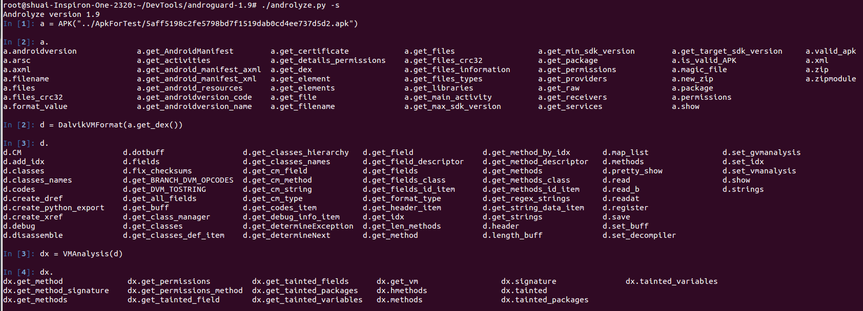 androlyze.py与其它的py文件不同,它不是单一功能的脚本,而是一个强大的静态分析工具,它提供的一个独立的Shell环境来辅助分析人员执行分析工作。