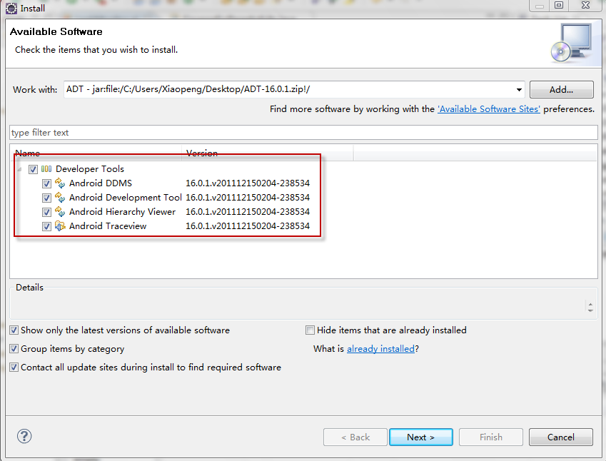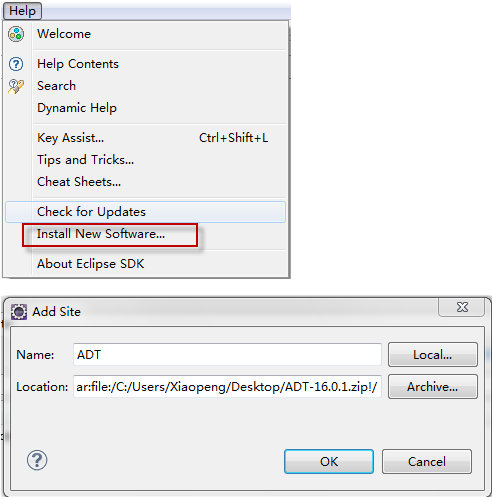 打开Eclipse-->Help-->Install new Software-->输入名字-->点击Archive选择ADT.zip-->OK-->Next......