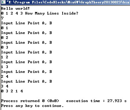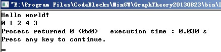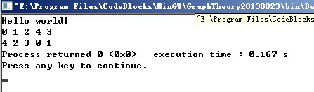 1 #include2 #include 3 4 using namespace std; 5 6 class Graph 7 { 8 private: 9 //访问控制 10 int p_nVisitList[5]; 11 int (* pBlock)[5]; 12 13 public: 14 Graph(int (*pParam)[5]); 15 ~Graph(); 16 //深度优先遍历 17 int DeepSearch(int Point = 0); 18 void BFS(); 19 void ResetVisit(); 20 }; 21 22 class ListNode 23 { 24 public: 25 int val; 26 int weight; 27 ListNode * next; 28 public: 29 ListNode(); 30 }; 31 ListNode::ListNode():val(0), weight(0), next(NULL) 32 { 33 ; 34 } 35 class GraphList 36 { 37 public: 38 GraphList(); 39 ~GraphList(); 40 void AddToListByOrder(int nitem, int Point); 41 void BFS(int n = 0);//这个广度优先遍历的代码太好写了 42 private: 43 int visit[5]; 44 ListNode * Next[5]; 45 }; 46 void GraphList::AddToListByOrder(int nitem, int Point)//前插法,代码好写 47 { 48 if(nitem >= 0 && nitem < 5 && Point >= 0 && Point < 5) 49 { 50 ListNode * pnewnode = new ListNode; 51 if(pnewnode == NULL) 52 return; 53 pnewnode->val = Point; 54 pnewnode->next = Next[nitem]; 55 Next[nitem] = pnewnode; 56 } 57 } 58 59 void GraphList::BFS(int n) 60 { 61 for(int i = 0;i < 5;++ i) 62 { 63 if(visit[i] == 0) 64 { 65 cout << i << ends; 66 visit[i] = 1; 67 } 68 ListNode * pLNTmp = Next[i]; 69 while(pLNTmp != NULL) 70 { 71 if(0 == visit[pLNTmp->val]) 72 { 73 cout << pLNTmp->val << ends; 74 visit[pLNTmp->val] = 1; 75 } 76 pLNTmp = pLNTmp -> next; 77 } 78 } 79 } 80 81 GraphList::GraphList() 82 { 83 for(int i = 0;i < 5;++ i) 84 { 85 visit[i] = 0; 86 Next[i] = NULL; 87 } 88 } 89 90 GraphList::~GraphList() 91 { 92 for(int i = 0;i < 5;++ i) 93 { 94 ListNode * ptmpLN; 95 while(Next[i] != NULL) 96 { 97 ptmpLN = Next[i]->next; 98 delete Next[i]; 99 Next[i] = ptmpLN; 100 } 101 } 102 } 103 104 void Graph::ResetVisit() 105 { 106 for(int i = 0;i < 5;++ i) 107 { 108 p_nVisitList[i] = 0; 109 } 110 } 111 Graph::Graph(int (*pParam)[5]) 112 { 113 for(int i = 0;i < 5;++ i) 114 p_nVisitList[i] = 0; 115 pBlock = pParam; 116 } 117 118 Graph::~Graph() 119 { 120 ;//nothing! 121 } 122 123 int Graph::DeepSearch(int Point) 124 { 125 p_nVisitList[Point] = 1; 126 cout << Point << ends; 127 128 for(int i = 0;i < 5;++ i) 129 { 130 if(1 == pBlock[Point][i] && 0 == p_nVisitList[i]) 131 { 132 DeepSearch(i); 133 } 134 } 135 return 0; 136 } 137 138 void Graph::BFS() 139 { 140 p_nVisitList[4] = 1; 141 cout << 4 << ends; 142 queue DL; 143 DL.push(4); 144 while(!DL.empty()) 145 { 146 int val = DL.front(); 147 DL.pop(); 148 for(int i = 0;i < 5;++ i) 149 { 150 if(1 == pBlock[val][i] && p_nVisitList[i] == 0) 151 { 152 cout << i << ends; 153 p_nVisitList[i] = 1; 154 DL.push(i); 155 } 156 } 157 } 158 } 159 160 int main() 161 { 162 cout << "Hello world!" << endl; 163 int Block[5][5] = \ 164 { 165 0, 1, 1, 1, 0, \ 166 1, 0, 1, 1, 0, \ 167 1, 1, 0, 0, 1, \ 168 1, 1, 0, 0, 1, \ 169 0, 0, 1, 1, 0 \ 170 }; 171 Graph tmpGph(Block); 172 tmpGph.DeepSearch(); 173 tmpGph.ResetVisit(); 174 cout << endl; 175 tmpGph.BFS(); 176 //New Job!!! 177 GraphList tmpGphLst; 178 int nLineNumbers = 0; 179 int nItem, Point; 180 cout << "How Many Lines Inside?" << endl; 181 cin >> nLineNumbers; 182 while(nLineNumbers --) 183 { 184 cout << "Input Line Point A, B" << endl; 185 cin >> nItem >> Point; 186 tmpGphLst.AddToListByOrder(nItem, Point); 187 } 188 tmpGphLst.BFS(); 189 cout << endl; 190 return 0; 191 }