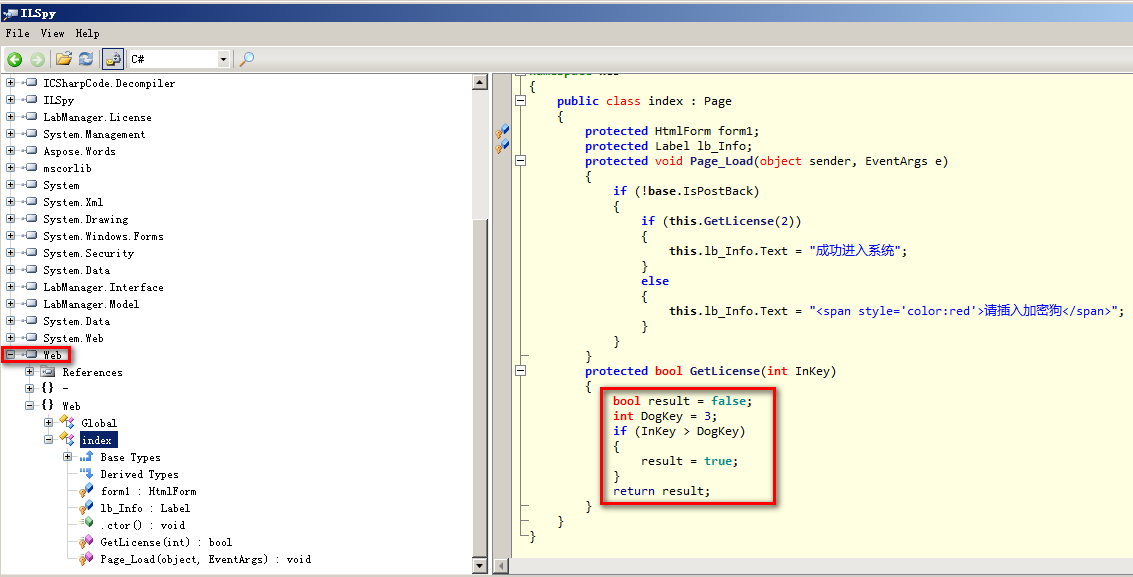 步骤一:使用ILSpy.exe打开Web.dll文件;查看其源代码的情况: