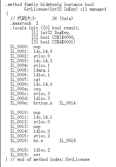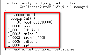 步骤四:修改GetLicense()方法内的IL代码,让它固定返回true;下面这个IL就是让它返回为true;修改完接着保存IL文件;