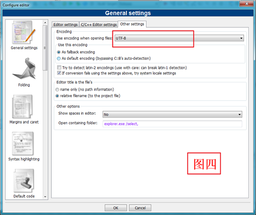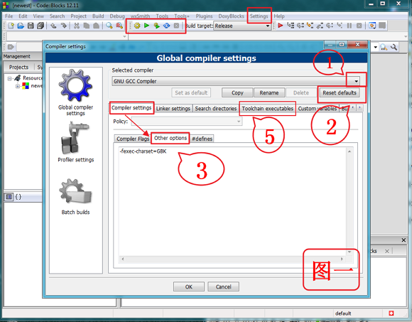 编译的过程中,一旦用到中文输出,往往会有乱码现象。下面统一使用UTF-8编码,通过Settings --> Compiler...打开下面“图一”窗口,并结合上面图二说明一下。