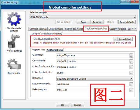 MingW32是默认的编译器,不论是否安装的是集成了该编译器的CodeBlocks版本,下载地址 http://tdm-gcc.tdragon.net/ 均可通过Settings --> Compiler...打开如下图所示窗口:指定编译器程序的根目录,并可通过是否包含 Program Files 选项卡下列出的程序进行判断。如果你用的是VC++(这个版本还不支持VS2012),类似的设置一下。