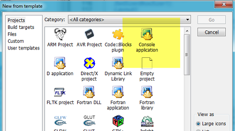 File --> New --> Project --> console application (下图)--> Go ,打开“console application”创建向导,