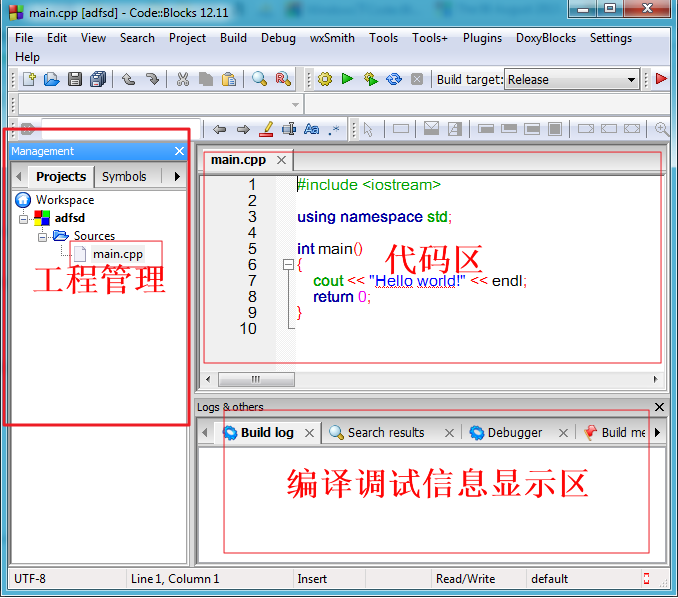 前面新建的Project 名称adfsd,双击main.cpp 打开右边代码区,点击正上方的工具按钮,编译、运行,在“信息显示区”可以看报告。也可以到工具目录下使用记事本查看.cpp文件。