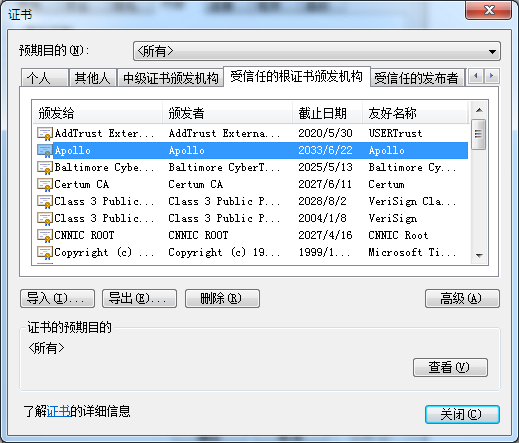 打开IE的“工具->Internet选项”对话框,选择“内容”选项卡,点击“证书”按钮,打开IE证书对话框,确认在“受信任的根证书颁发机构”选项卡中包含刚才导入的代码签名证书,如图20所示:
