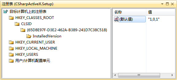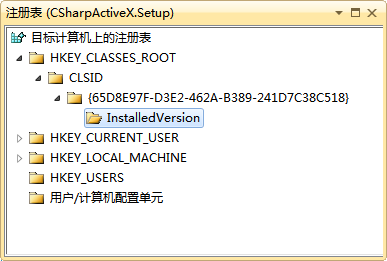 该步骤有几个地方需要特别说明。首先,{GUID}指的是ActiveX控件类的GUID,对应本文MacActiveX类指定的GUID,且该项需要包括左右花括号;其次,如果该安装项目用于发布多个ActiveX控件(类),需要创建多个{GUID}/InstalledVersion路径;最后,InstalledVersion的默认键值的主次版本号间是用“,”分隔,而不是“.”,后续升级时,需要同步升级该键值版本号。