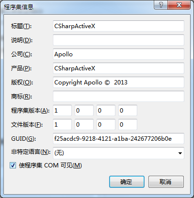 此处有一个关键操作,需要设置类库项目属性->程序集信息->使程序集COM可见,如图2所示:
