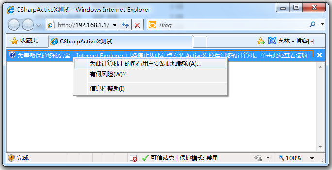 此时,再访问测试页面http://192.168.1.1/test.htm,IE就会提示安装ActiveX控件了,而不再需要将站点添加到可信站点并设置IE选项了。