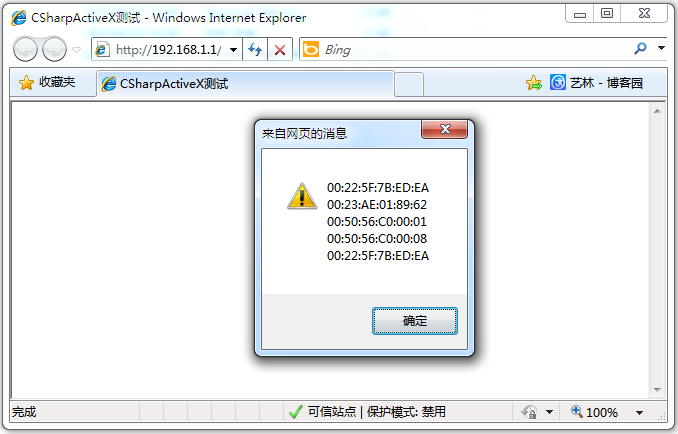 ActiveX控件在IE浏览器端的部署会因ActiveX控件是否签名而有所区别。下面就以此分类进行说明。当然,首先需要将test.htm和CSharpActiveX.CAB文件部署到服务器上,假设部署后的访问地址为http://192.168.1.1/test.htm。