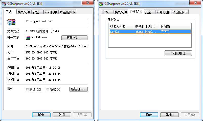 本文源码提供了一份测试PKCS#12文件Apollo.pfx,PIN码为11111111。在Visual Studio命令提示(2010)中,进入源码的CAB目录,输入如下命令即可对ActiveX控件进行签名操作了: