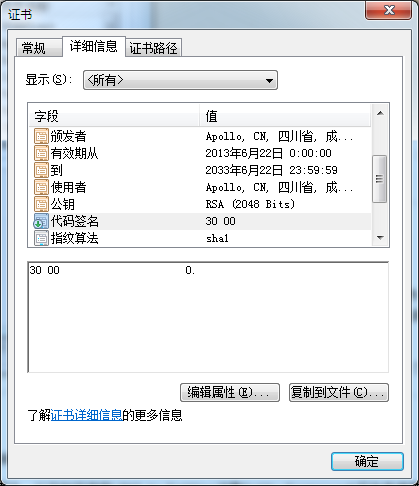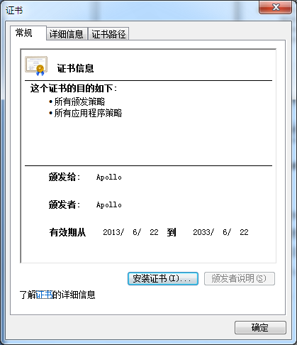 因为IE默认允许安装并运行收信任的已签名ActiveX控件,所以通过对ActiveX控件签名,可以有效简化浏览器端的配置工作。你仅需要安装签名所用的证书及其证书链文件(本文源码提供的签名文件所含证书是自签名证书,所以它的证书链就只是它自己)。打开源码CAB目录下的Apollo.cer(与Apollo.pfx文件对应的数字证书文件)代码签名证书文件,如图18所示: