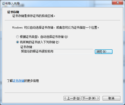 点击“安装证书”按钮,将该证书安装到“受信任的根证书颁发机构”,如图19所示: