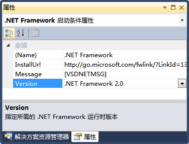 按F4快捷键,打开属性窗口,设置.NET Framework项的Version为“.NET Framework 2.0”,如图6所示: